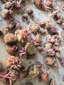 Then, last week, I read that it was time to plant potatoes. Remembering that we didn’t eat all of last year’s crop, I went to retrieve what had been left under the house and hoped we had enough sprouts to plant. Imagine my surprise when I discovered more sprouts than I could count and way more than we could possibly plant in our available space.